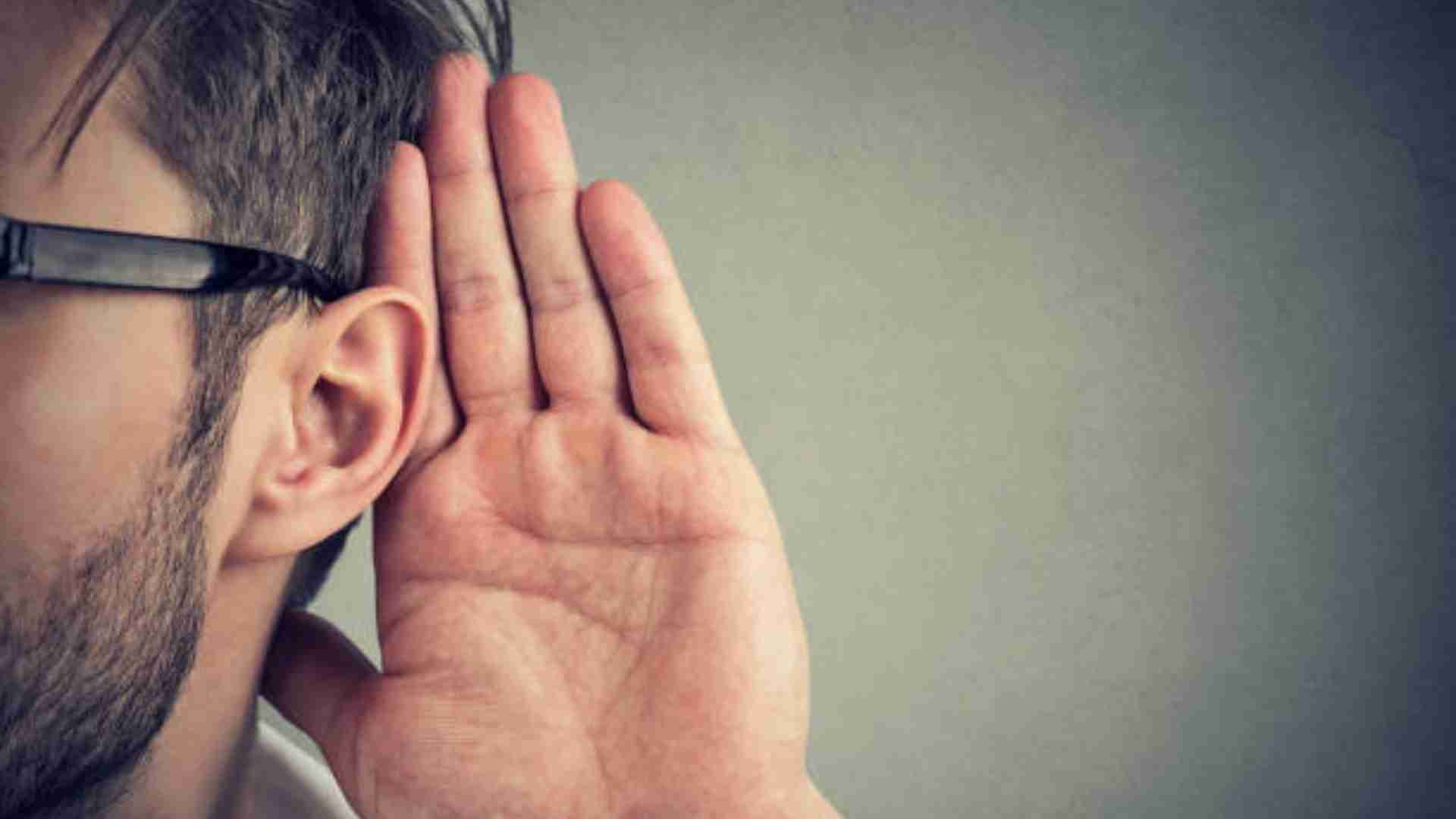 Veo a un hombre muy atento, poniendo la mano en su oreja para no perderse nada.